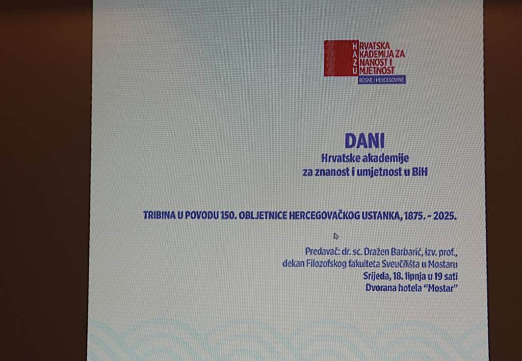 MOSTAR, 18. lipnja (FENA) – U okviru manifestacije "Dani Hrvatske akademije za znanost i umjetnost u BiH", u srijedu navečer održana je tribina povodom 150. obljetnice Hercegovačkog ustanka (1875. – 2025.), a predavanje je održao dekan Filozofskog fakulteta Sveučilišta u Mostaru prof. dr. sc. Dražen Barbarić.