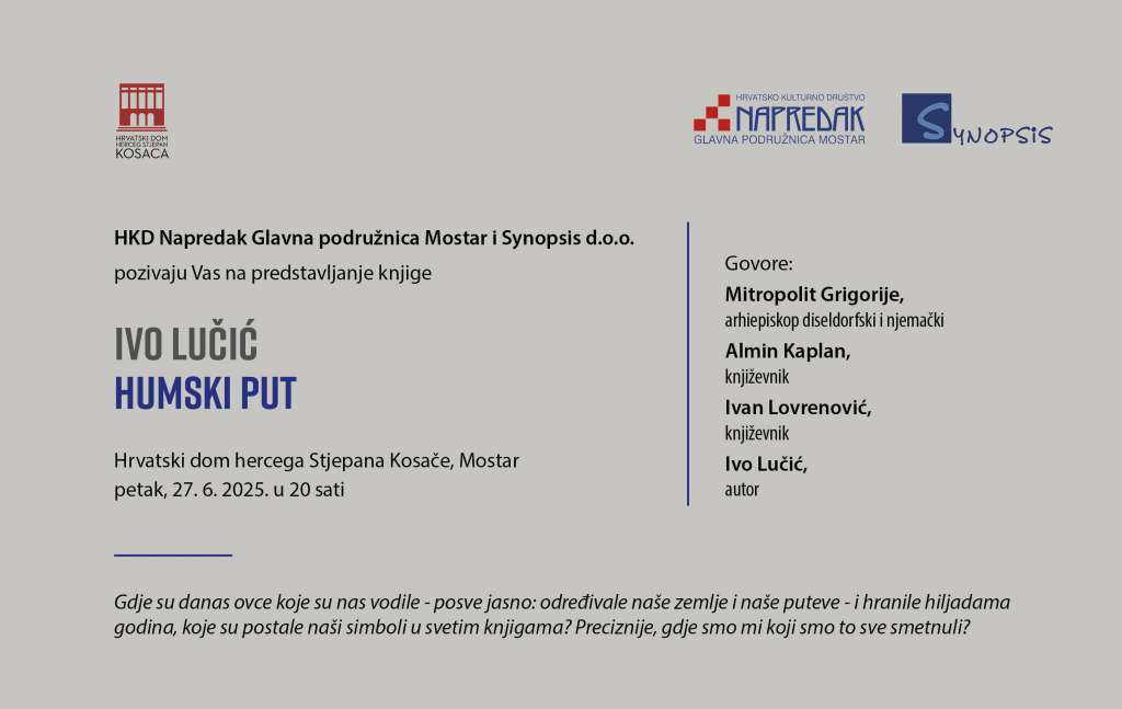 MOSTAR, 20. lipnja (FENA) – U organizaciji Hrvatskog kulturnog društva (HKD) Napredak Glavne podružnice Mostar, u petak, 27. lipnja, s početkom u 20 sati, u Hrvatskom domu hercega Stjepana Kosače u Mostaru bit će upriličeno predstavljanje knjige Ive Lučića pod nazivom ''Humski put'', objavljene 2024. godine u izdanju izdavačke kuće Synopsis d.o.o. Zagreb/Sarajevo i HKD-a Napredak.