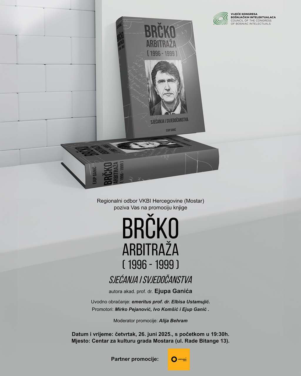 MOSTAR, 25. lipnja (FENA) - U dvorani Centra za kulturu Mostar u četvrtak, 26. lipnja, s početkom u 19.30 sati bit će održana promocija knjige Brčko Arbitraža (1996-1999) autora Ejupa Ganića.