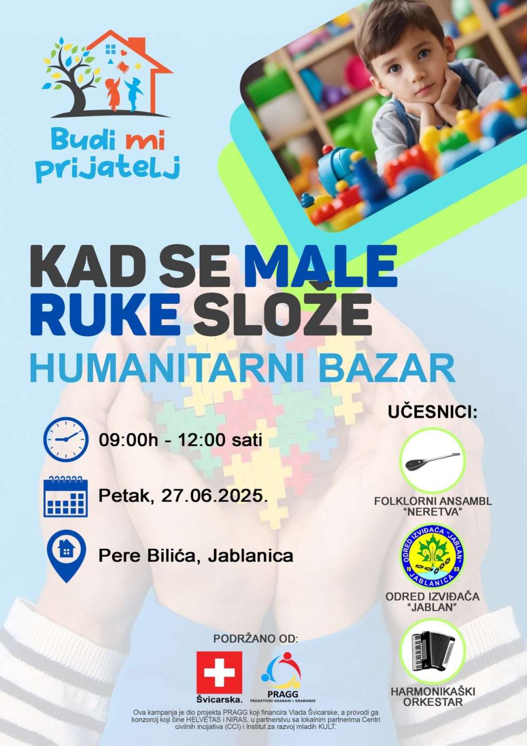 JABLANICA, 26. lipnja (FENA) – Humanitarni bazar na kojem će se prikupljati sredstva za otvaranje prvog Inkluzivnog centra u Jablanici održat će se sutra, 27. lipnja, od 9 do 12 sati u centru te općine.