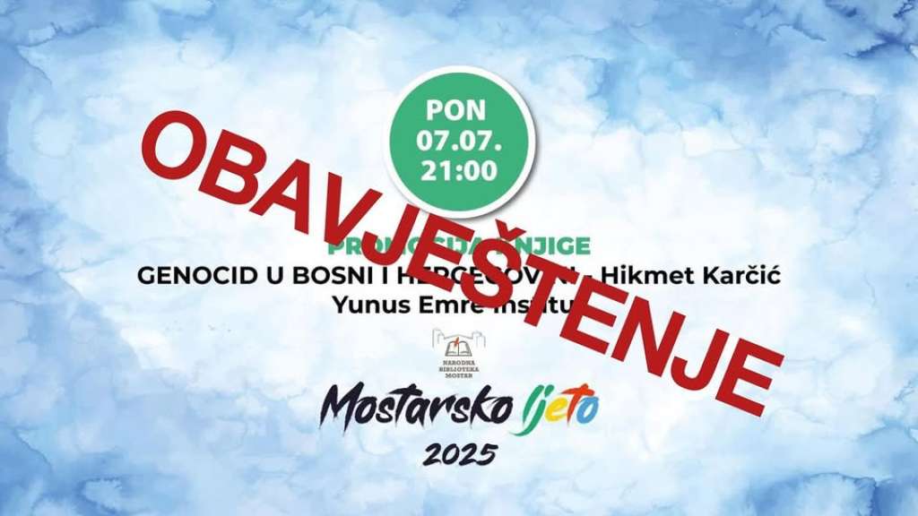 MOSTAR, 7. jula (FENA) - Promocija knjige "Genocid u Bosni i Hercgovini" Hikmeta Karčića, koja je trebala biti održana večeras u Mostaru, otkazana je zbog prisustva autora na komemoraciji u Evropskom parlamentu.
