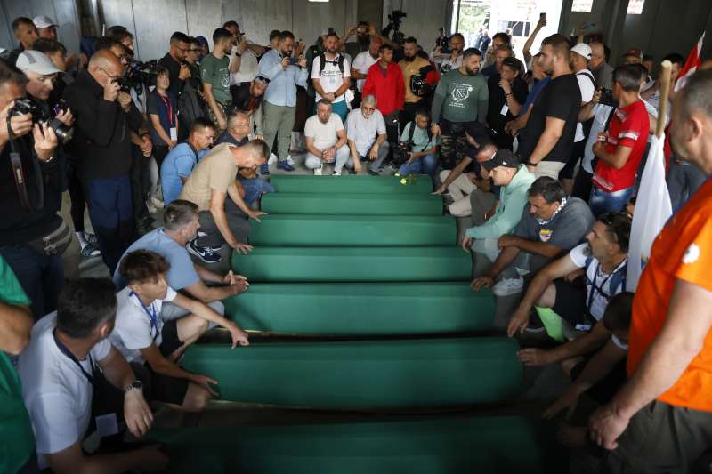 SREBRENICA, 10. jula (FENA) - Učesnici Marša mira i članovi porodica iznijeli su večeras tabute s posmrtnim ostacima žrtava genocida na musalu Memorijalnog centra Srebrenica-Potočari.