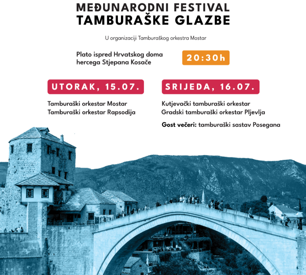 MOSTAR, 15. srpnja (FENA) - Prvi međunarodni festival tamburaške glazbe ''TamburaMo'' počinje večeras na platou ispred Hrvatskog doma hercega Stjepana Kosače u Mostaru, a trajat će do 17. srpnja, u organizaciji Tamburaškog orkestra Mostar.