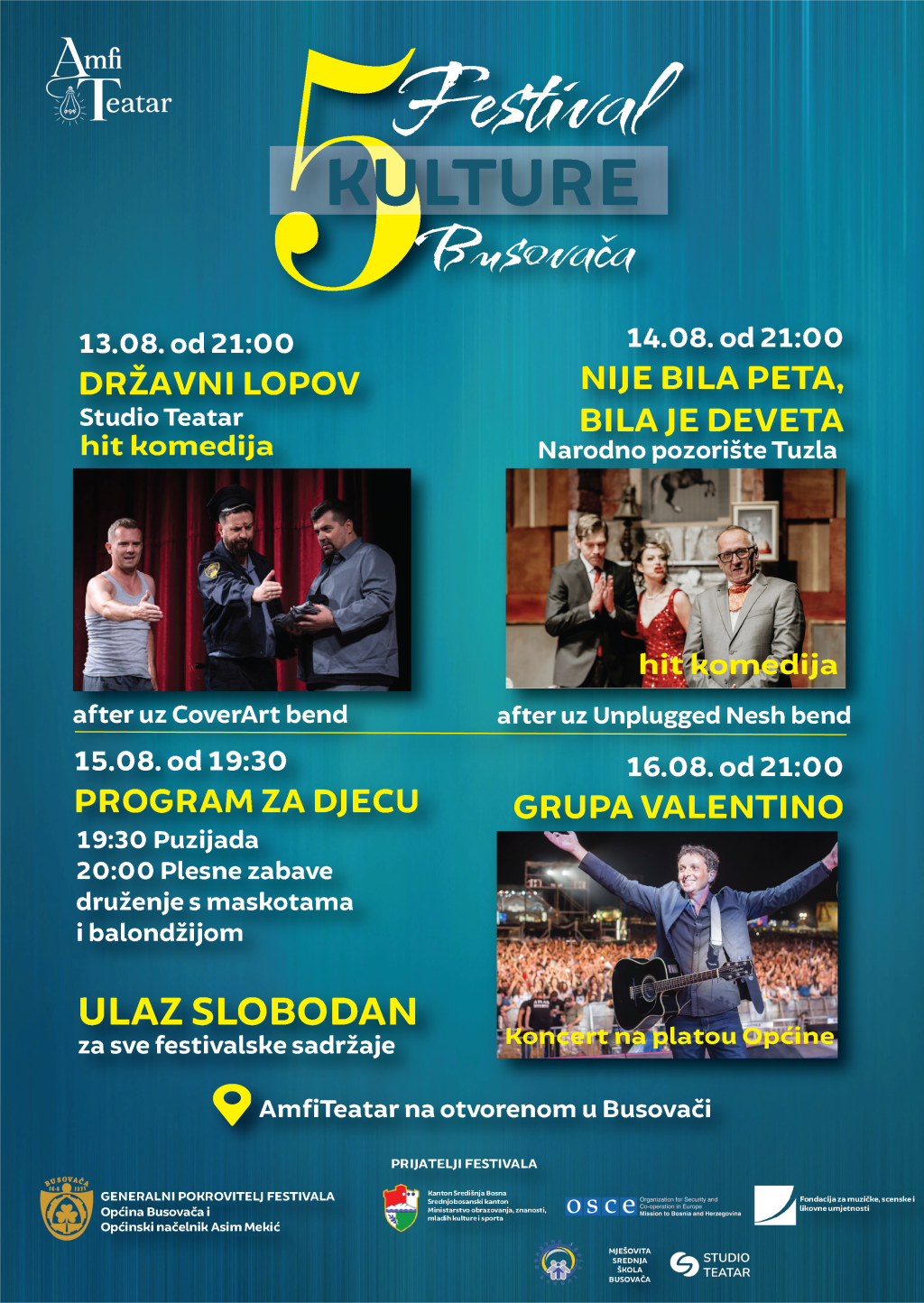 BUSOVAČA, 5. kolovoza (FENA) - Peti međunarodni "Festival kulture Busovača 2025." održati će se od 13. do 16. kolovoza, a publika će imati priliku uživati u raznovrsnom programu za sve generacije.