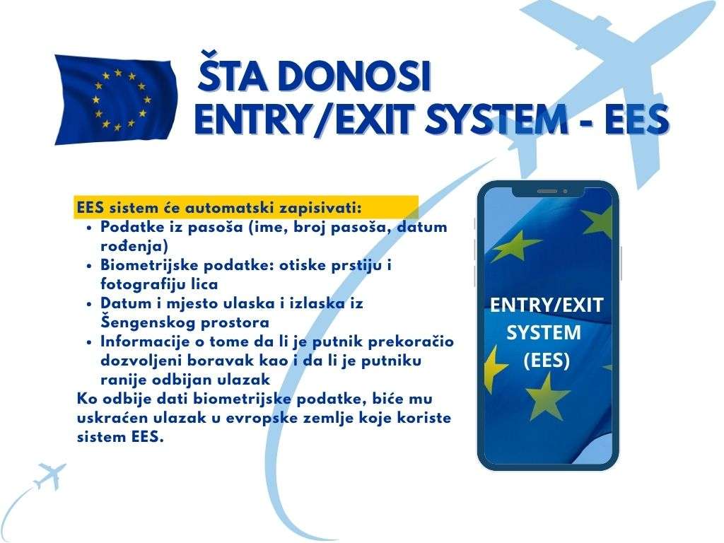 EES sistem će automatski zapisivati: lične podatke iz pasoša, biometrijske podatke, kao što su otisak prstiju i fotografija, datum i mjesto ulaska i izlaska iz Šengenskog prostora te informacije o tome da li je putnik prekoračio dozvoljeni boravak kao i da li mu je ranije odbijan ulazak. Ko odbije da ustupi biometrijske podatke, bit će mu uskraćen ulazak u europske zemlje koje koriste EES.