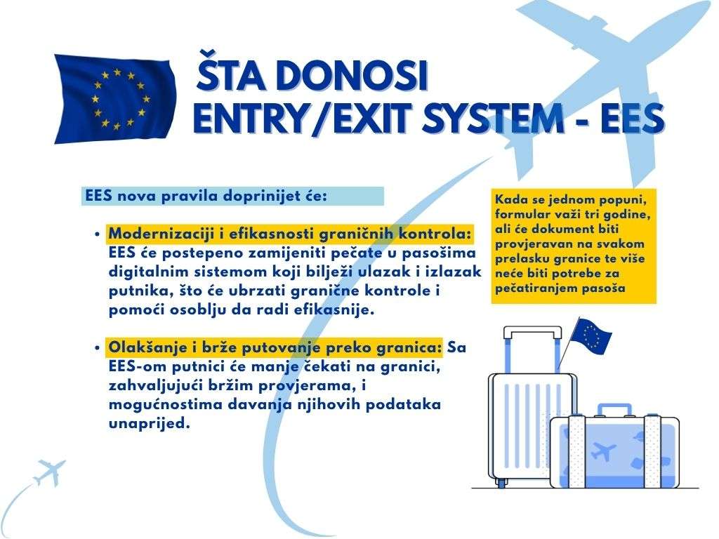 Ovaj sistem bi umnogome mogao doprinijeti modernizaciji i efikasnosti graničnih kontrola, jer će postepeno zamijeniti pečate u pasošima digitalnim sistemom koji bilježi ulazak i izlazak putnika. Ovakav način rada će ubrzati granične kontrole i pomoći osoblju da radi efikasnije. Sa EES-om, putnici će manje čekati na granici, zahvaljujući bržim provjerama i mogućnostima davanja njihovih podataka unaprijed.