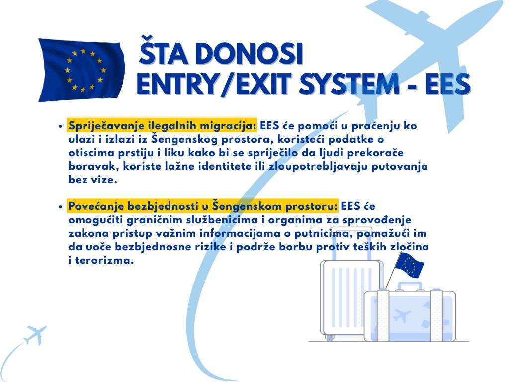 Sistem podrazumijeva digitalnu registraciju građana iz 59 zemalja koje nisu članice Europske unije te uključuje zemlje zapadnog Balkana: Srbiju, Crnu Goru, Bosnu i Hercegovinu, Sjevernu Makedoniju i Albaniju, navodi se u saopćenju Europske komisije. Odnosi se na putnike koji planiraju kraći boravak, a važit će za sve EU članice osim Republike Irske i Kipra, kao i za Lihtenštajn, Norvešku, Island i Švicarsku.