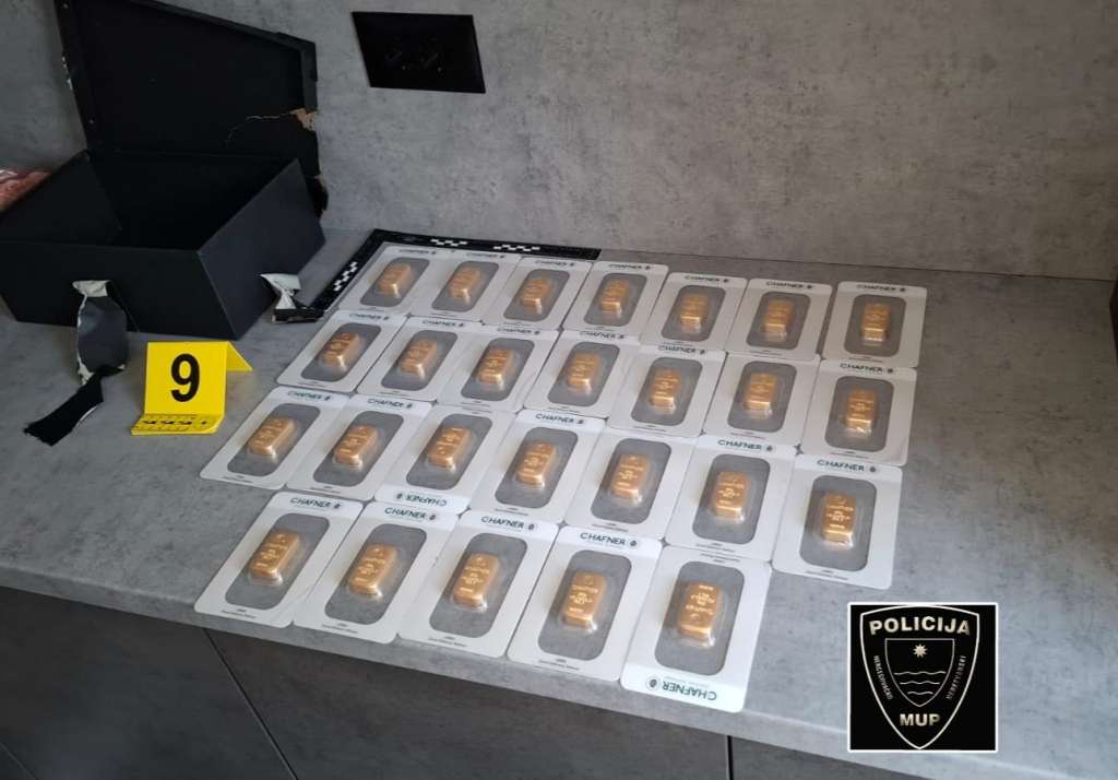 RAVNO, 12. kolovoza (FENA) - U pretresu stambenog objekta u mjestu Trebinja u općini Ravno policijski službenici Uprave policije Ministarstva unutarnjih poslova Hercegovačko-neretvanske županije pronašli su 26 poluga zlata ukupne mase 6,5 kilograma, određenu količinu krivotvorenog novca i drogu.