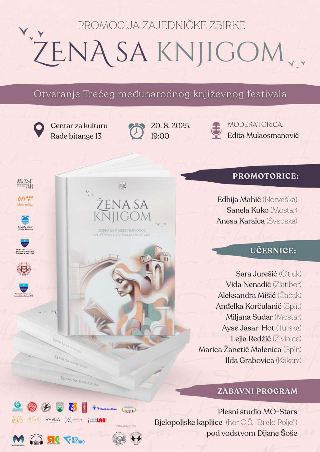 MOSTAR, 20. augusta (FENA) - Treći međunarodni književni festival "Žena sa knjigom“ održat će se od 20. do 24. augusta u šest bosanskohercegovačkih gradova, u Mostaru, Stocu, Ilidži, Visokom, Kraljevoj Sutjesci i Travniku, a njegovo otvaranje bit će upriličeno večeras u mostarskom Centru za kulturu u 19 sati.