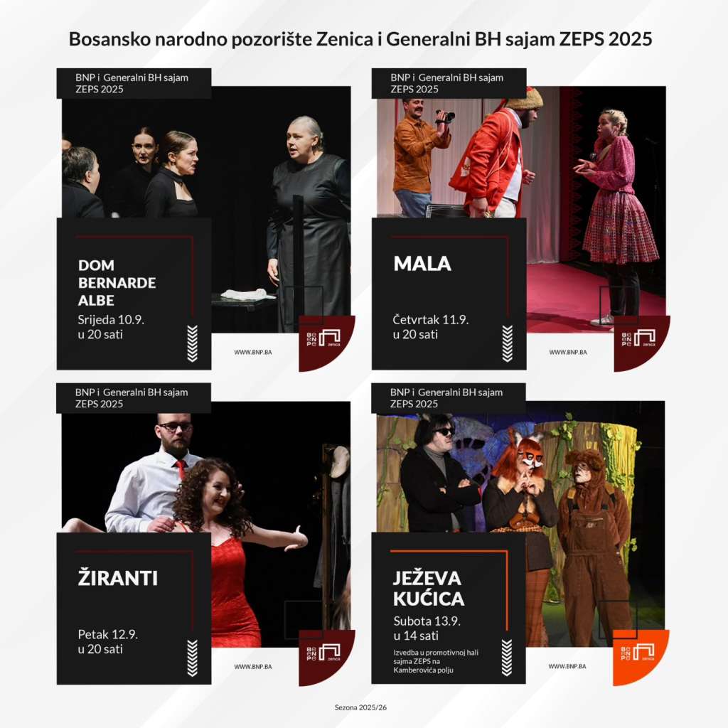 ZENICA, 25. augustA (FENA) - U saradnji sa Generalnim BH sajmom ZEPS 2025 ove godine će Bosansko narodno pozorište Zenica prikazati ukupno četiri nove predstave koje će se održati za vrijeme samog sajme.