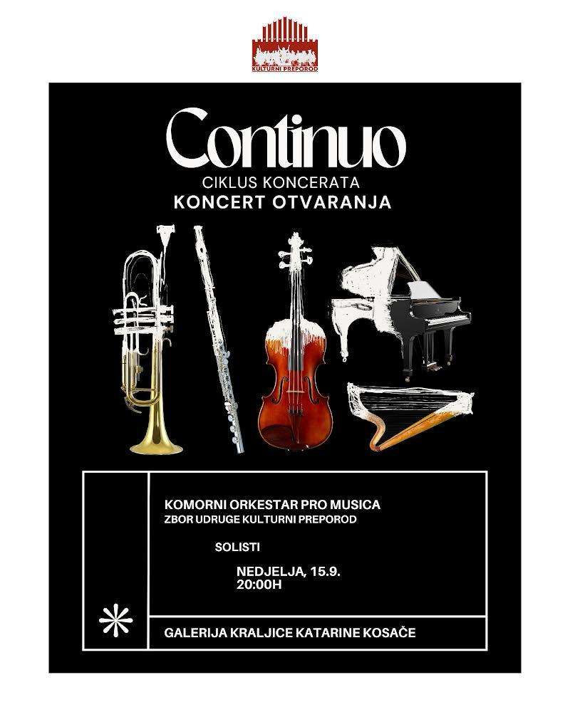 MOSTAR, 6. listoopada (FENA) - Druga sezone koncertnog ciklusa "Continuo", u organizaciji Udruge „Kulturni preporod“, bit će otvoren u četvrtak, 9. listopada, u 18 sati, u prostoru Galerije kraljice Katarine, Hrvatski dom hercega Stjepana Kosače.