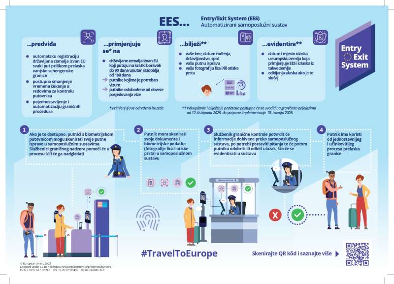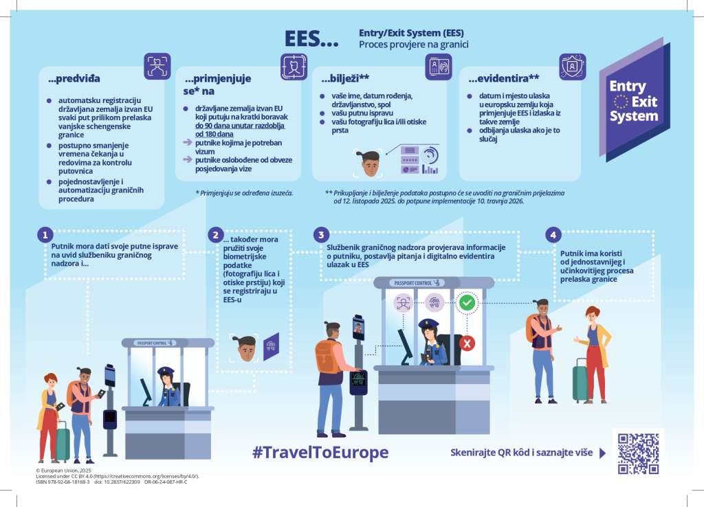 Sistem ulaska/izlaska (EES) je automatizirani sistem koji zahtijeva da putnici na granici skeniraju pasoš te daju otiske prstiju i fotografiju. Uvođenje sistema trajat će šest mjeseci, a cilj mu je otkrivanje osoba koje prekorače dozvoljeni boravak, suzbijanje krađe identiteta i sprječavanje ilegalnih migracija, uslijed političkog pritiska u nekim zemljama EU da zauzmu oštriji stav, piše Reuters.