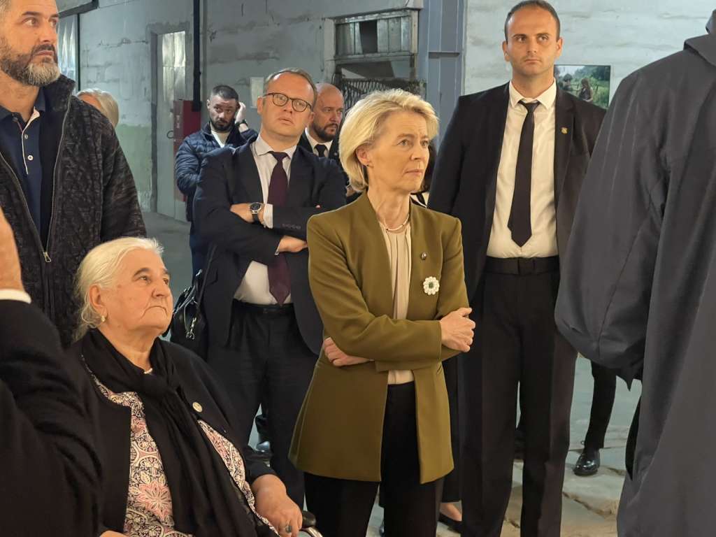 U pratnji Munire Subašić, predsjednice udruženja "Majke Srebrenice i Žepe", Emira Suljagića, direktora Memorijalnog centra, Luigija Sorece, šefa Delegacije EU u BiH, i Hamdije Fejzića, predsjednika Upravnog odbora Centra, Ursula von der Leyen odala je počast žrtvama genocida.