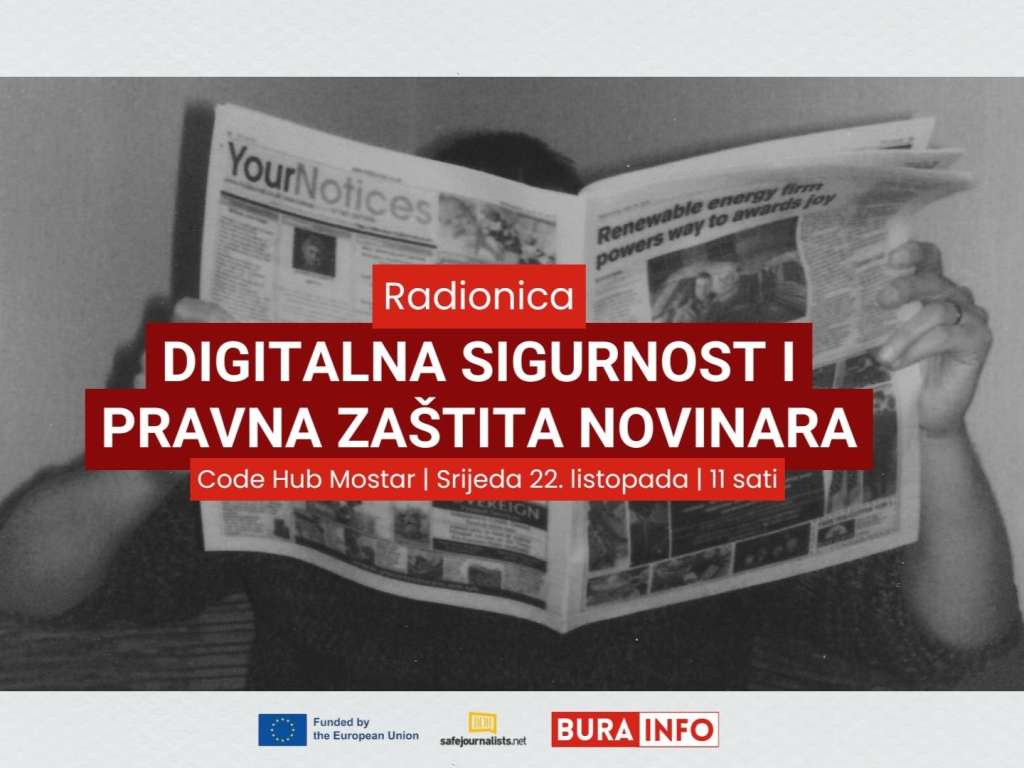MOSTAR, 20. listopada (FENA) - U Mostaru će se u srijedu, 22. listopada, održati radionica pod nazivom "Digitalna sigurnost i pravna zaštita novinara" koju u sklopu regionalnog programa "SafeJournalists" organizira Udruga Bura info.