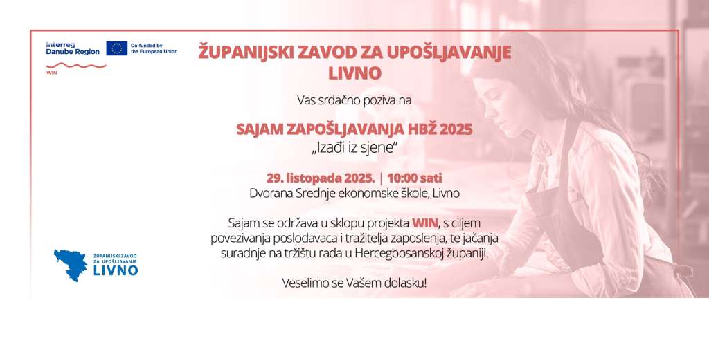 LIVNO, 27. listopada (FENA) - Županijski zavod za upošljavanje Livno organizira Sajam zapošljavanja HBŽ 2025 pod motom „Izađi iz sjene“ koji će se održati u srijedu, 29. listopada, u dvorani Srednje ekonomske škole Livno s početkom u 10 sati.
