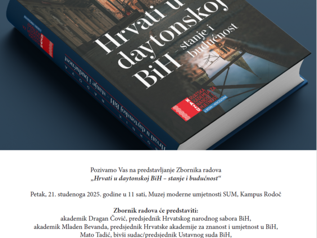 MOSTAR, 14. studenoga (FENA) – Predstavljanje Zbornika radova „Hrvati u daytonskoj BiH – stanje i budućnost“ upriličit će se u petak, 21. studenoga s početkom u 11 sati u Muzeju moderne umjetnosti Sveučilišta u Mostaru.