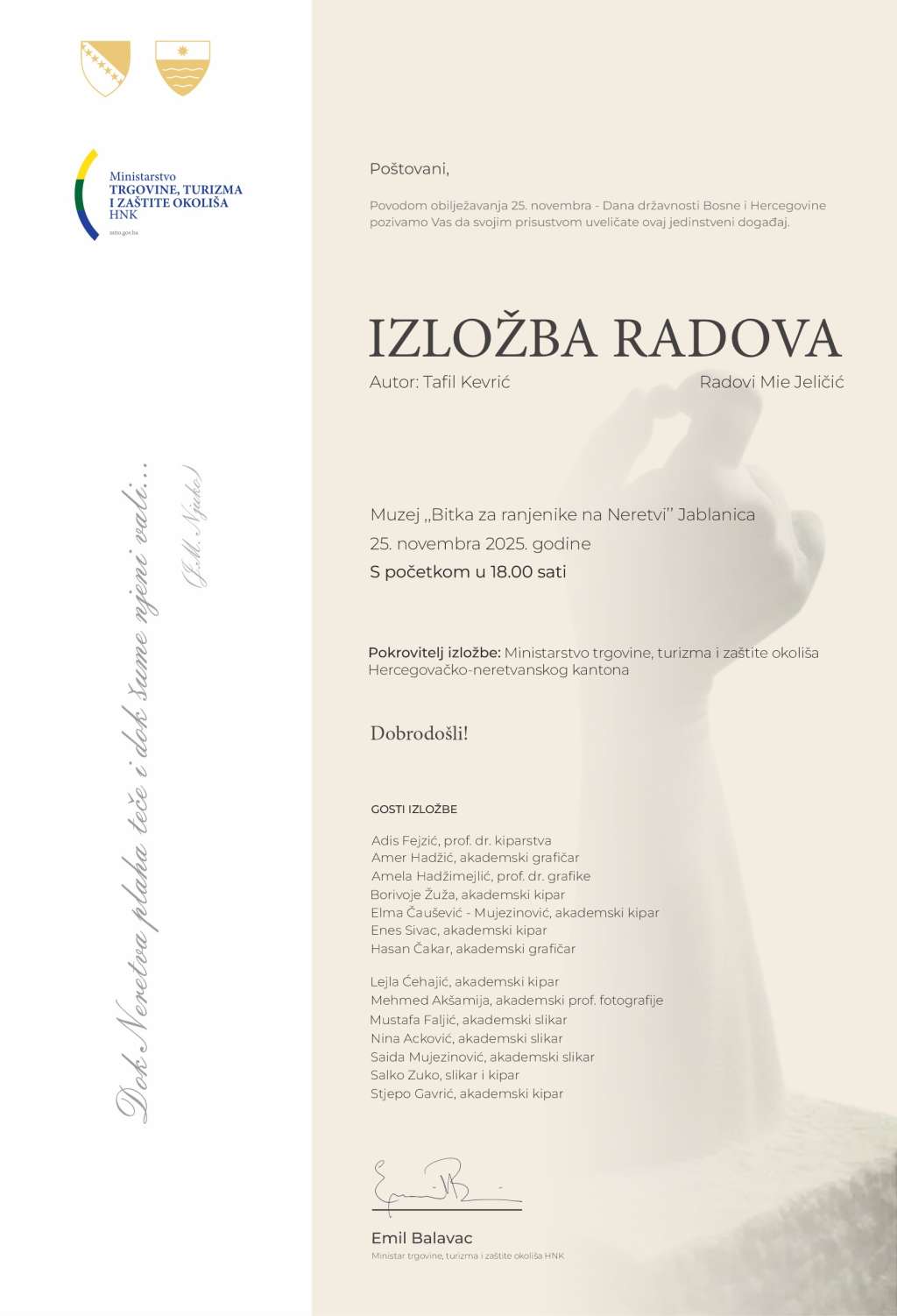 JABLANICA, 24. novembra (FENA) - U povodu obilježavanja Dana državnosti Bosne i Hercegovine, Ministarstvo trgovine, turizma i zaštite okoliša Hercegovačko-neretvanskog kantona organizuje otvaranje izložbe radova akademskih kipara, slikara i grafičara iz Bosne i Hercegovine.