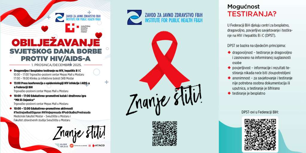 MOSTAR, 24. studenoga (FENA) - Svjetski dan borbe protiv HIV/AIDS-a obilježava se u ponedjeljak, 1. prosinca, a Zavod za javno zdravstvo (ZJZ) Federacije Bosne i Hercegovine, u suradnji s Sveučilišnom kliničkom bolnicom (SKB) Mostar, Asocijacijom infektologa u Bosni i Hercegovini i Udruženjem "Partnerstvo za zdravlje" taj dan obilježit će, uz slogan "Znanje štiti", različitim aktivnostima u Mostaru.