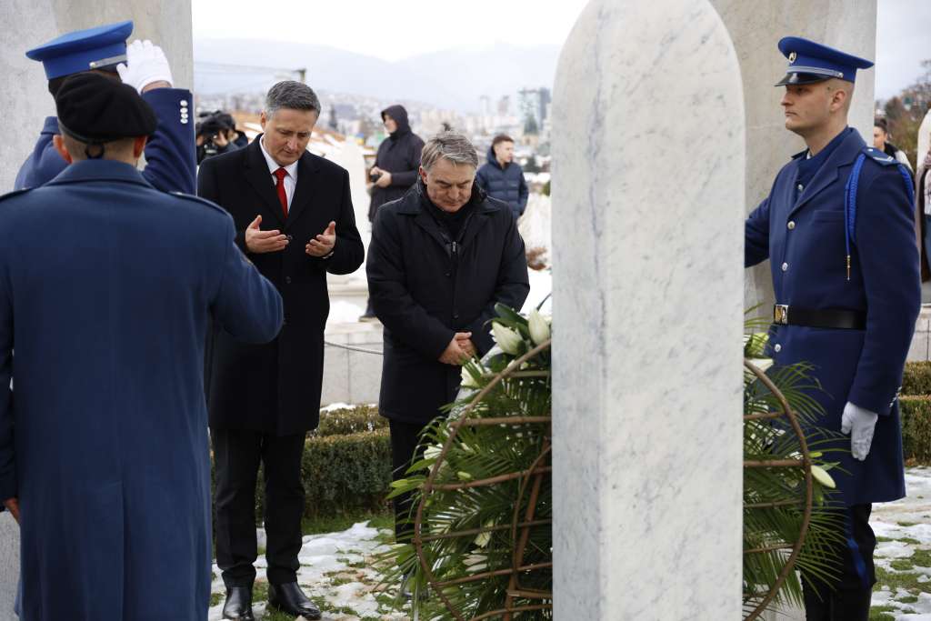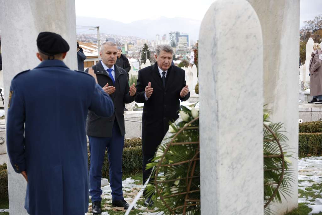 SARAJEVO, 25. novembra (FENA) - Dan državnosti Bosne i Hercegovine, 25. novembar obilježen je na Mezarju Kovači u Sarajevu. Brojne delegacije svih nivoa vlasti u BiH su učenjem Fatihe, minutom šutnje i polaganjem cvijeća odale počast svim braniocima zemlje. Cvijeće su, među ostalima, položili članovi Predsjedništva Bosne i Hercegovine Željko Komšić i Denis Bećirović, koji su svim građanima BiH čestitali Dan državnosti, poručivši im da je država neuništiva.