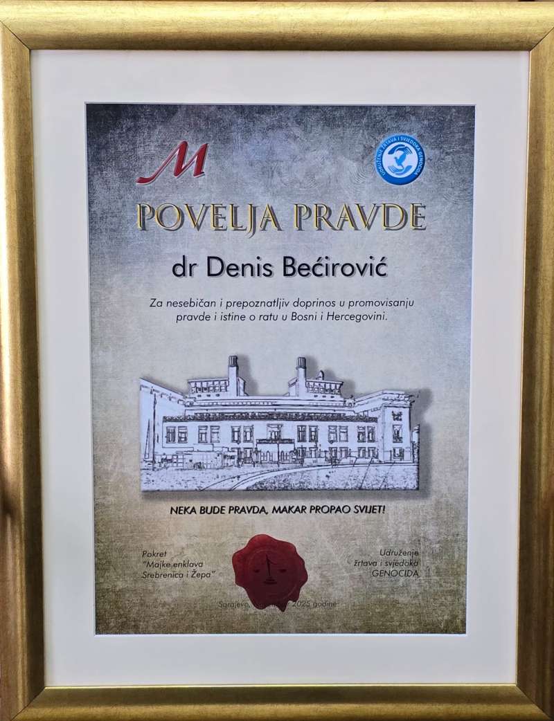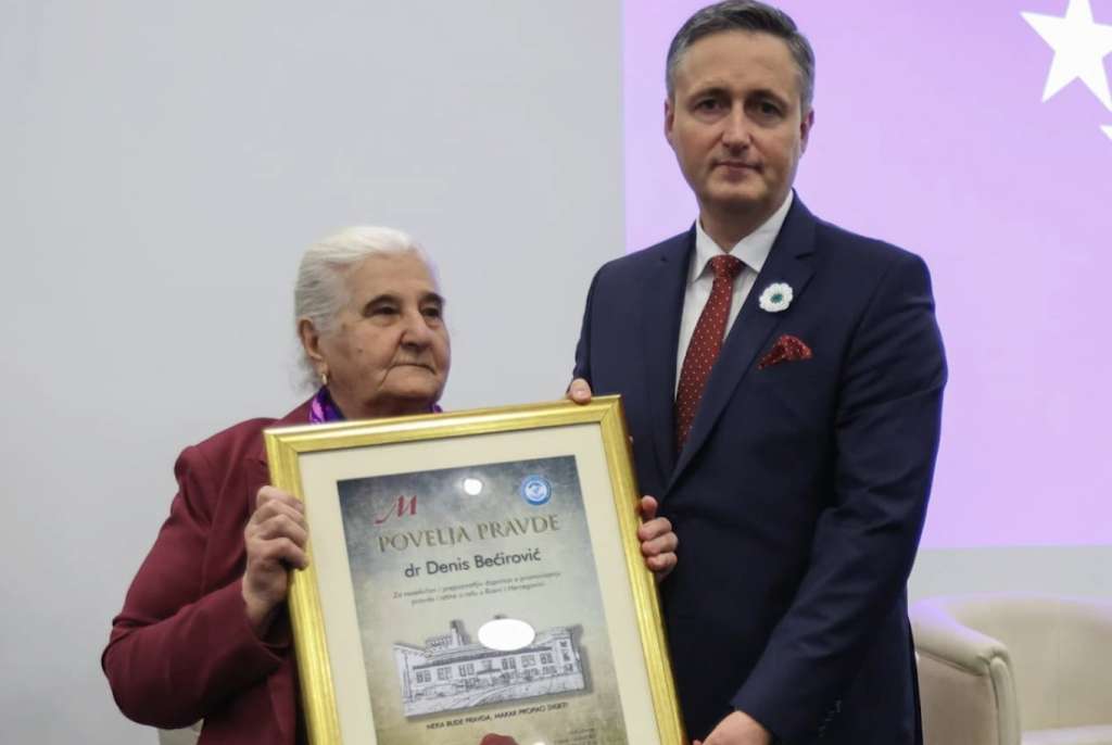 SARAJEVO, 26. novembar (FENA) - Članu Predsjedništva Bosne i Hercegovine Denisu Bećiroviću uručena je Povelja pravde, priznanje koje se dodjeljuje istaknutim pojedincima za njihov lični i prepoznatljiv doprinos promoviranju pravde i istine o ratu u BiH. Ovo priznanje uručila mu je predsjednica Pokreta „Majke enklava Srebrenica i Žepa“ Munira Subašić.