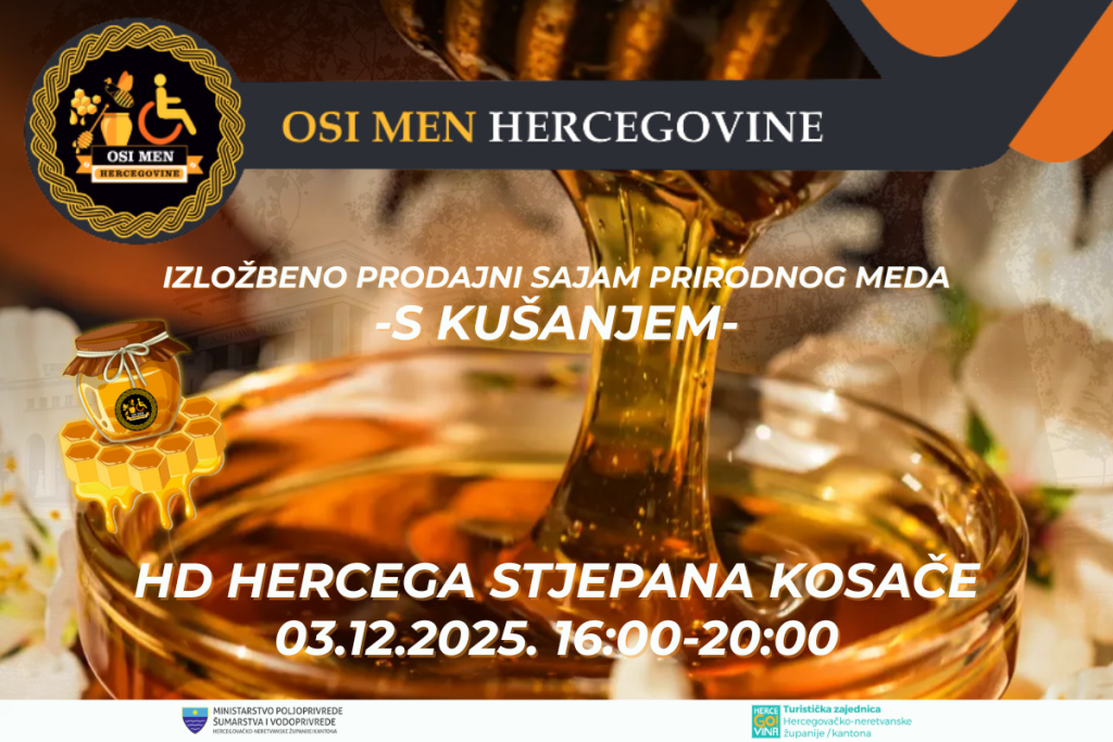 MOSTAR, 1. prosinca (FENA) - Izložbeno-prodajni sajam prirodnog meda s kušanjem održat će se u srijedu, 3. prosinca, u razdoblju od 16 do 20 sati u Galeriji kraljice Katarine (Hrvatski dom Herceg Stjepan Kosača) u Mostaru.