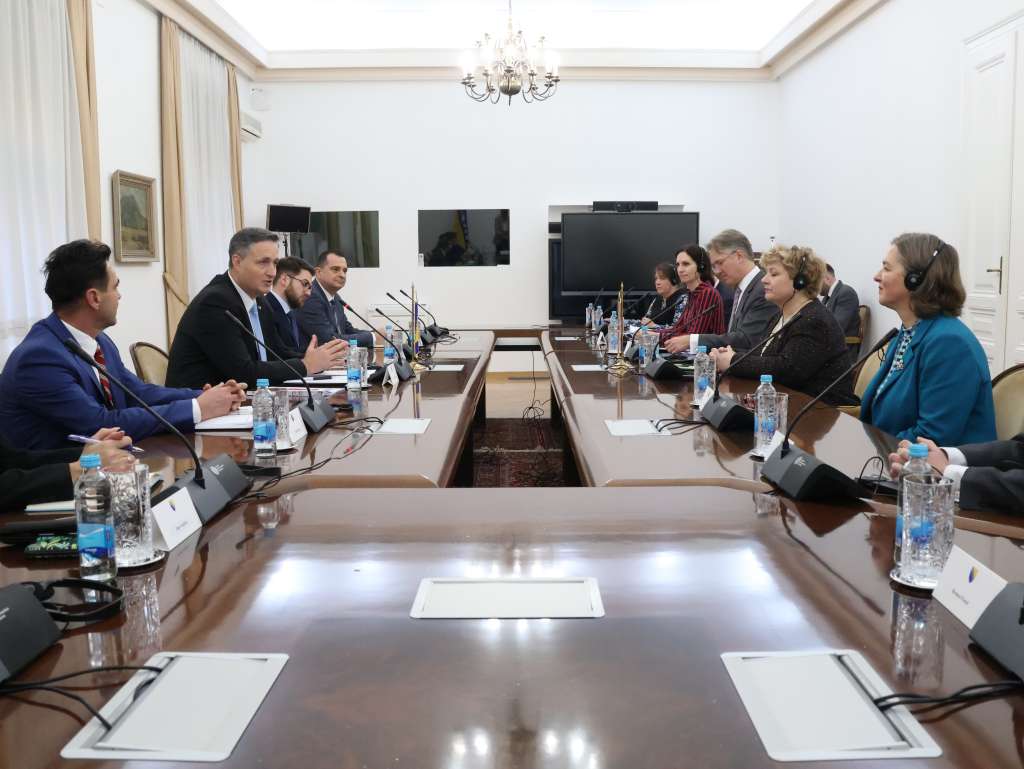 SARAJEVO, 3. decembra (FENA) - Član Predsjedništva Bosne i Hercegovine Denis Bećirović razgovarao je s parlamentarnom delegacijom Odbora za pitanja vanjske politike Parlamenta Ujedinjenog Kraljevstva Velike Britanije i Sjeverne Irske (UK), koju su činili Emily Thornberry (predsjednica Odbora), Fleur Anderson, Aphra Brandreth, Phil Brickell, Richard Foord i sir John Whittingdale.
