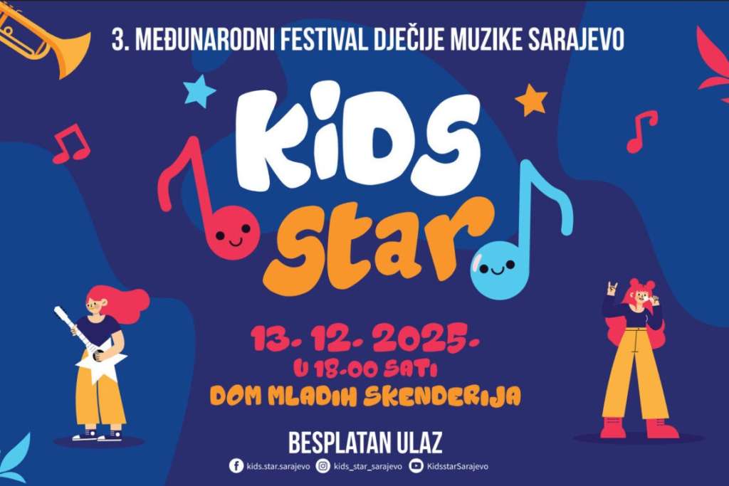 SARAJEVO, 5. decembra (FENA) - Treći međunarodni festival dječije muzike Sarajevo „Kids Star“ bit će održan 13. decembra u Domu mladih Skenderija, u orgaizaciji Udruženja za očuvanje i razvoj umjetnosti „Artista“. Na pozornici će 20 izvođača iz BiH, Hrvatske, Srbije, Crne Gore, Slovenije i Ukrajine u kategorijama: Male i Mlade zvijezde, pokazati svoj talenat, energiju i ljubav prema muzici.