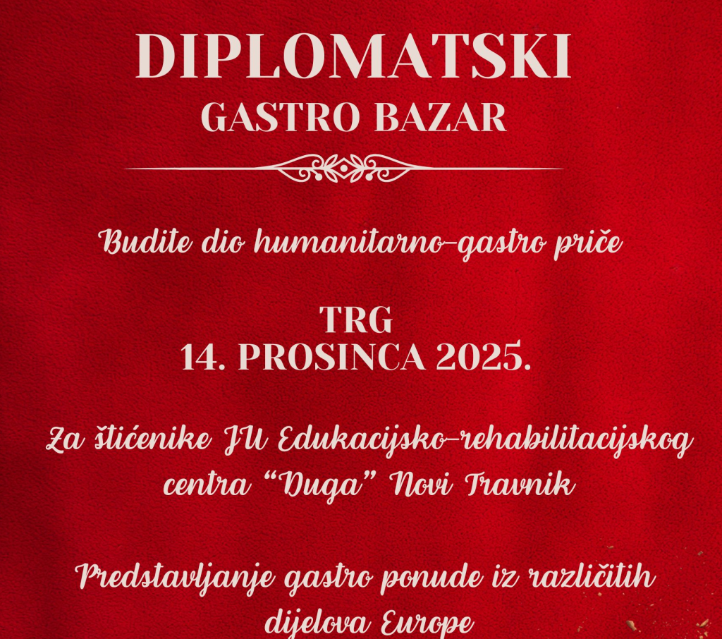 NOVI TRAVNIK, 8. prosinca (FENA) - Prvi Diplomatski gastro bazar u Novom Travniku održat će se u nedjelju, 14. prosinca, s početkom od 18 sati, na Gradskom trgu.