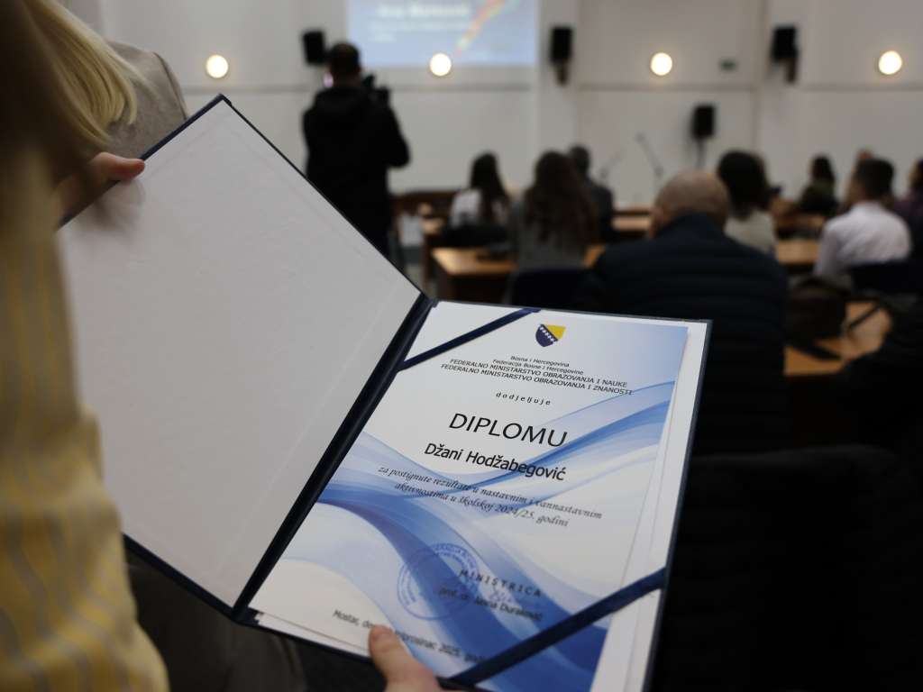 MOSTAR, 15. prosinca (FENA) - Svečana manifestacija dodjele nagrada najboljim učenicima osnovnih i srednjih škola u Federaciji Bosne i Hercegovine za školsku 2024./2025. godinu održana je u ponedjeljak u Mostaru, gdje je federalna ministrica obrazovanja i znanosti Jasna Duraković uručila diplome i novčane nagrade za 54 najuspješnija učenika te priznanja školama koje sustavno prepoznaju i razvijaju učeničke talente.