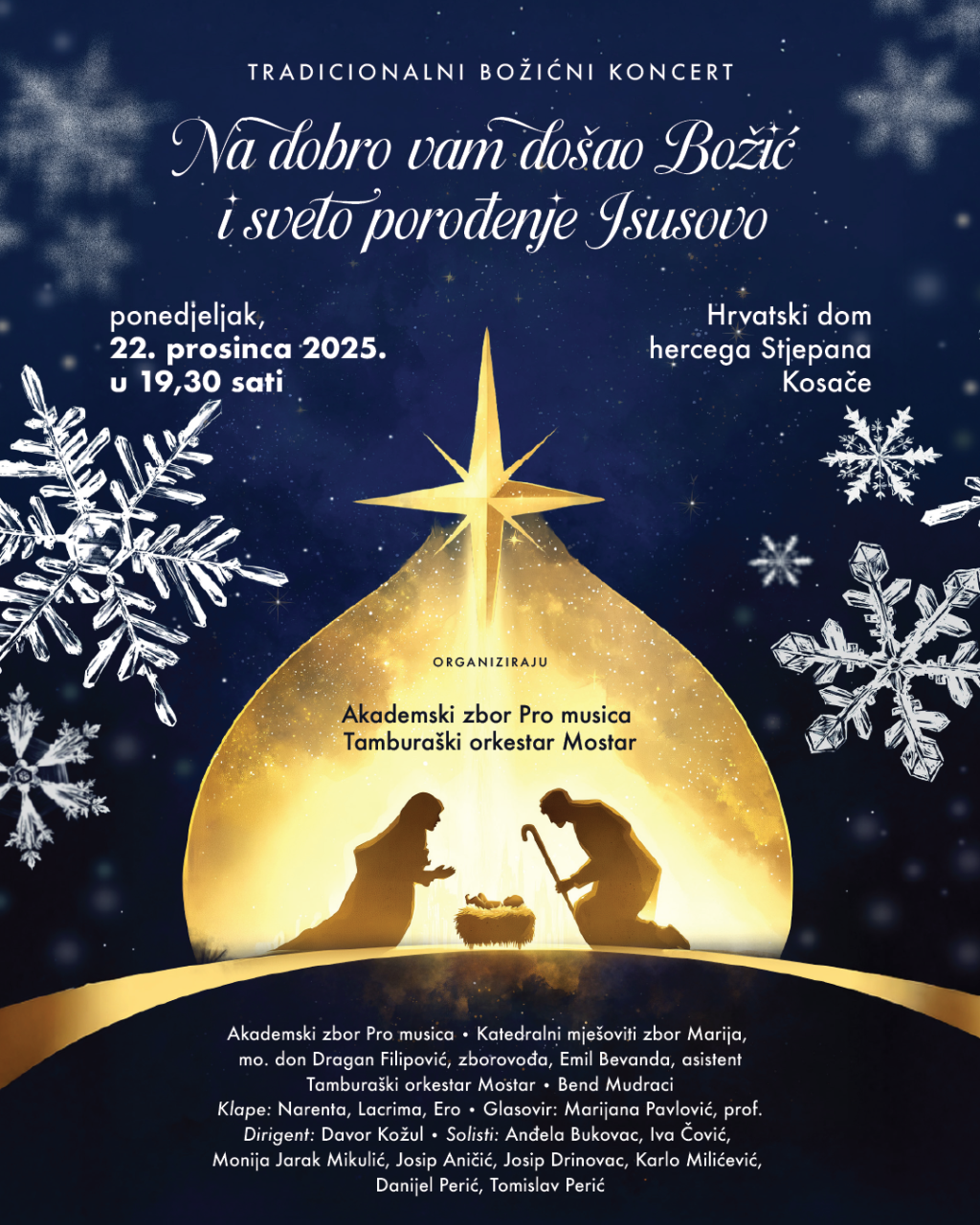 MOSTAR, 22. prosinca (FENA) - U organizaciji Akademskog zbora Pro musica i Tamburaškog orkestra Mostar večeras u 19.30 sati u velikoj dvorani Hrvatskoga doma hercega Stjepana Kosače u Mostaru bit će održan tradicionalni božićni koncert "Na dobro vam došao Božić i sveto porođenje Isusovo".