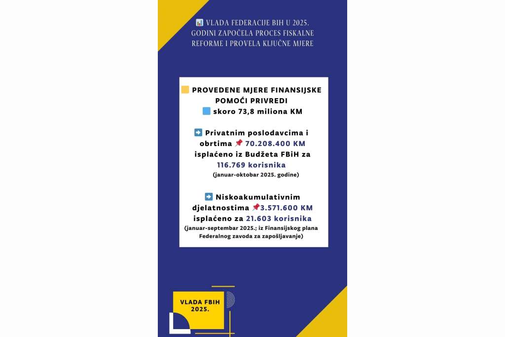 Paralelno s povećanjem minimalne plaće, Vlada Federacije BiH je, s ciljem očuvanja zaposlenosti i stabilnosti poslovanja, provela mjere finansijske podrške privatnim poslodavcima, obrtima i ostalim samostalnim djelatnostima, kao i niskoakumulativnim djelatnostima. Ukupan iznos finansijske podrške privredi dostigao je iznos od 73.780.000 KM. Za prvih devet mjeseci 2025. godine privatnim poslodavcima i obrtima iz Budžeta FBiH izdvojeno je 70.208.400 KM za ukupno 116.769 korisnika, dok je zaključno sa septembrom osigurano dodatnih 3.174.900 KM za 21.603 korisnika iz niskoakumulativnih djelatnosti, saopćeno je iz Federalne vlade.
