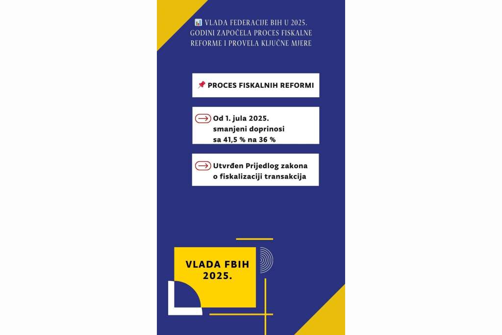 U okviru fiskalnih reformi, od 1. jula 2025. godine započela je primjena izmjena Zakona o doprinosima, kojima je ukupna zbirna stopa doprinosa u Federaciji BiH smanjena je sa 41,5 posto na 36 posto, čime je dodatno rasterećena privreda i stvoren povoljniji ambijent za očuvanje postojećih i otvaranje novih radnih mjesta. Također, Vlada Federacije BiH je utvrdila i u parlamentarnu proceduru uputila i Prijedlog zakona o fiskalizaciji transakcija, čiji cilj je suzbijanje sive ekonomije.