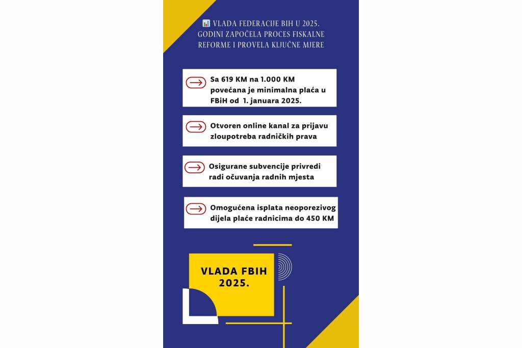 Od 1. januara 2025. godine minimalna plaća u Federaciji BiH povećana je sa 619 KM na 1.000 KM, čime je ostvaren značajan iskorak u poboljšanju standarda radnika.