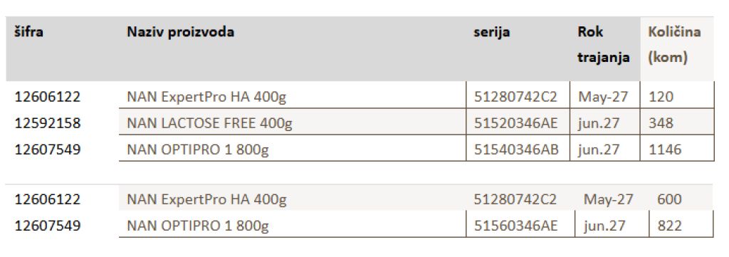 MOSTAR, 7. siječnja (FENA) - Poduzeće Nestlé Adriatic BH d.o.o. Sarajevo obavijestilo je putem web stranice nestle.ba da je dobrovoljno i iz predostrožnosti započet opoziv pojedinih serija NAN formula za dojenčad zbog potencijalne prisutnosti cereulida, tvari koju proizvodi mikroorganizam Bacillus cereus, u jednom od sastojaka dobavljača korištenih u predmetnim serijama, objavila je u srijedu Agencija za sigurnost hrane BiH.