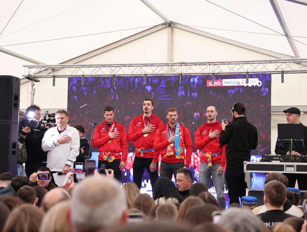 LJUBUŠKI, 4. veljače (FENA) - Velik broj Ljubušaka, ali i ostalih iz Hercegovine, u srijedu je u Ljubuškom dočekao četvoricu rukometaša koji dolaze iz ovog mjesta, koji su igrali u Rukometnom klubu (RK) Izviđač Agram te su s reprezentacijom Hrvatske na tek završenom Europskom rukometnom prvenstvu osvojili brončanu medalju. Brončane rukometaše Davida Mandića, Mateja Mandića, Ivana Pavlovića i Diana Nerisa Ćešku prvo je ugostio Ljubuški gradonačelnik Vedran Markotić, a onda nakon svečanog prijema i ljubuška publika.