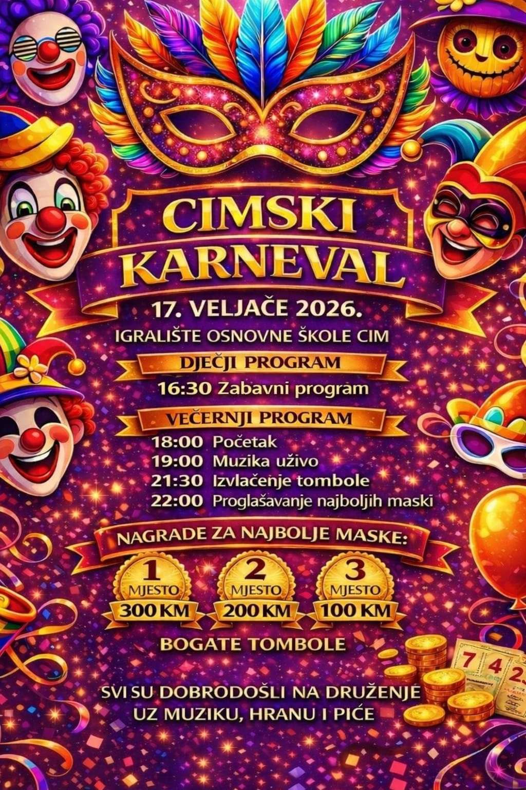 MOSTAR, 14. veljače (FENA) - Manifestacija "Cimski karneval 2026" održat će se u utorak, 17. veljače, u mostarskom naselju Cim, na igralištu Osnovne škole, a organizatori su najavili kako će sve generacije moći uživati u bogatom programu.
