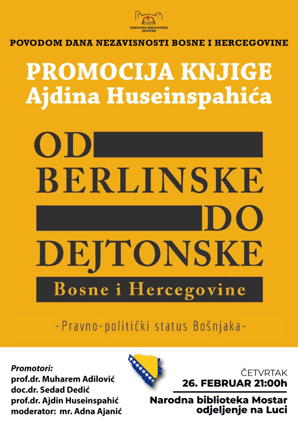 MOSTAR, 23. veljače (FENA) - Narodna biblioteka Mostar, povodom 1. ožujka, Dana neovisnosti Bosne i Hercegovine organizira promociju knjige "Od berlinske do daytonske Bosne i Hercegovine: pravno-politički status Bošnjaka" autora Ajdina Huseinspahića koja će se održati u četvrtak, 26. veljače, u Klubu čitatelja Narodne biblioteke Mostar s početkom u 21 sat.