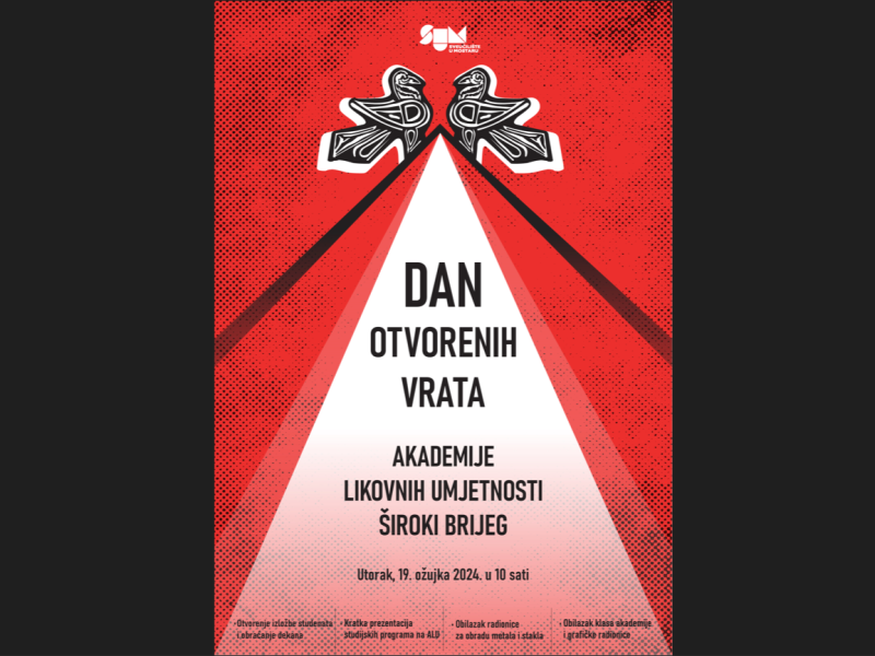 ŠIROKI BRIJEG, 23. ožujka (FENA) - Akademija likovnih umjetnosti Sveučilišta u Mostaru (SUM) održat će Dan otvorenih vrata u petak, 27. ožujka, u Širokom Brijegu, a program počinje otvaranjem izložbe studentskih radova u 10 sati u Sveučilišnoj galeriji Akademije.