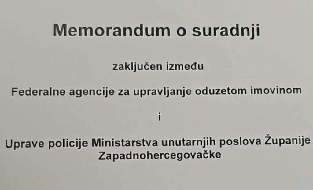 NEUM, 24. ožujka (FENA) - Memorandum o suradnji između Federalne agencije za upravljanje oduzetom imovinom i Uprave policije Ministarstva unutarnjih poslova Županije Zapadnohercegovačke potpisan je utorak u Neumu.