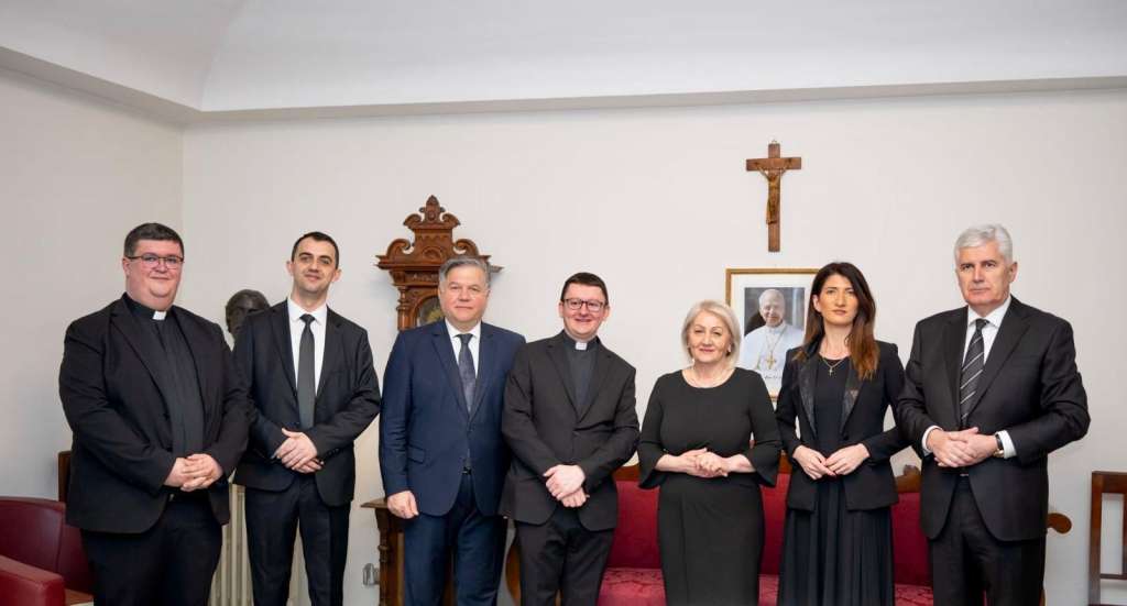 RIM, 26. ožujka (FENA) - U sklopu posjeta Vatikanu, izaslanstvo dužnosnika HDZ-a s razine BiH, predvođeno predsjedateljicom Vijeća ministara BiH Borjanom Krišto te dopredsjedateljem Doma naroda PS BIH Draganom Čovićem, zastupnicom u Zastupničkom domu PS BiH Darijanom Filipović i zamjenikom ministra vanjskih poslova BiH Josipom Brkićem, posjetilo je Papinski hrvatski zavod svetoga Jeronima i hrvatsku crkvu sv. Jeronima u Rimu, koja zauzima posebno mjesto u duhovnoj i povijesnoj baštini hrvatskoga naroda.