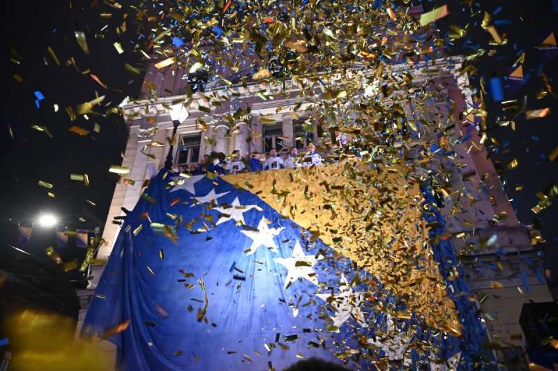 SARAJEVO, 1. aprila (FENA) - Desetine hiljada ljudi okupilo se večeras u Sarajevu u Titovoj ulici, ispred Vječne vatre, gdje su dočekali nogometaše BiH sa kojim su proslavili plasman na Svjetsko prvenstvo.