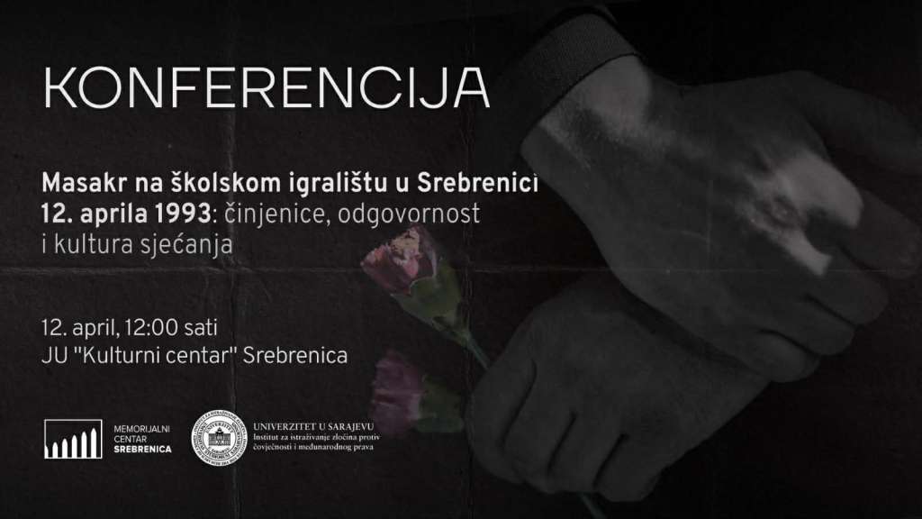 SARAJEVO, 7. aprila (FENA) - Memorijalni centar Srebrenica i Institut za istraživanje zločina protiv čovječnosti i međunarodnog prava Univerziteta u Sarajevu organizuje konferenciju "Masakr na školskom igralištu u Srebrenici 12. aprila 1993: činjenice, odgovornost i kultura sjećanja", posvećenu jednom od najtežih zločina počinjenih nad civilnim stanovništvom tokom agresije na Republiku Bosnu i Hercegovinu.