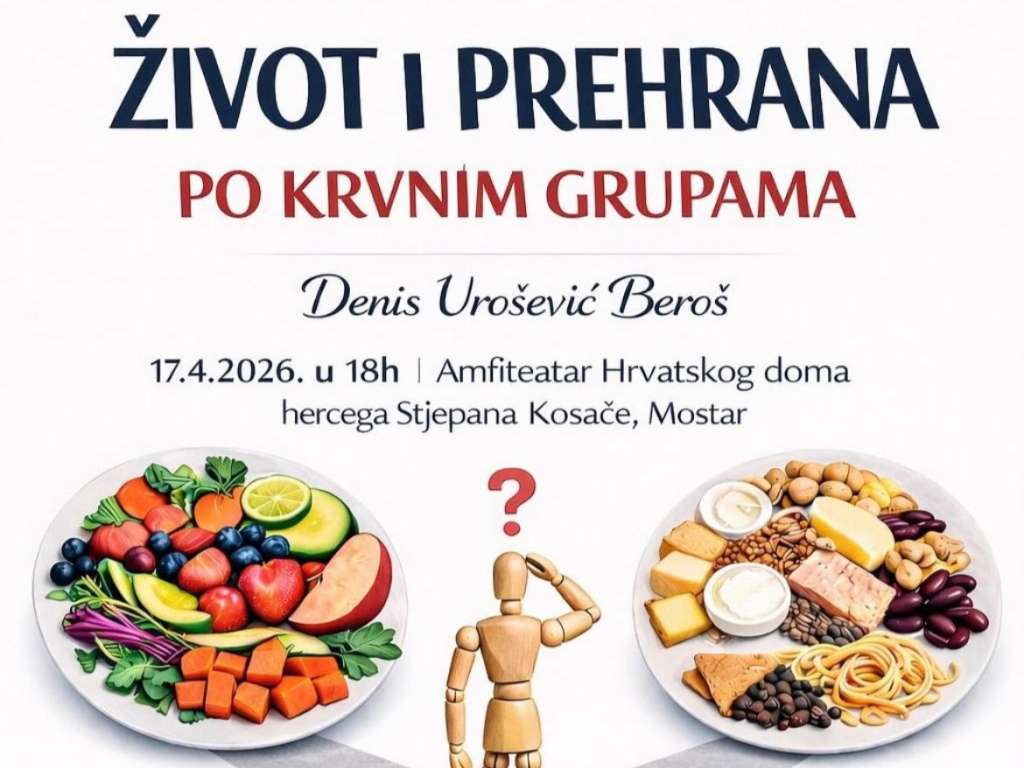 MOSTAR, 13. travnja (FENA) - Predavanje „Život i prehrana po krvnim grupama” održat će Denis Urošević-Beroš u petak, 17. travnja u 18 sati u amfiteatru Hrvatskog doma hercega Stjepana Kosače u Mostaru.