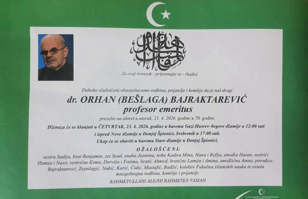 SARAJEVO, 21. aprila (FENA) – Dženaza dugogodišnjem profesoru Fakulteta islamskih nauka u Sarajevu dr. Orhanu Bajraktareviću, koji je danas preselio na ahiret u 70. godini života, bit će klanjana u četvrtak, 23. aprila, u 12.00 sati u haremu Gazi Husrev-begove džamije u Sarajevu, javlja MINA.