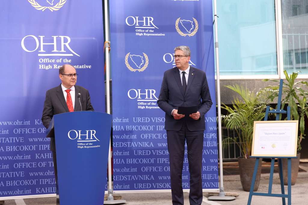 SARAJEVO, April 28 (FENA) – The High Representative Christian Schmidt and Sarajevo Mayor Samir Avdić ceremonially unveiled the “Dayton Peace Square” plaque in front of the Office of the High Representative building in Sarajevo.