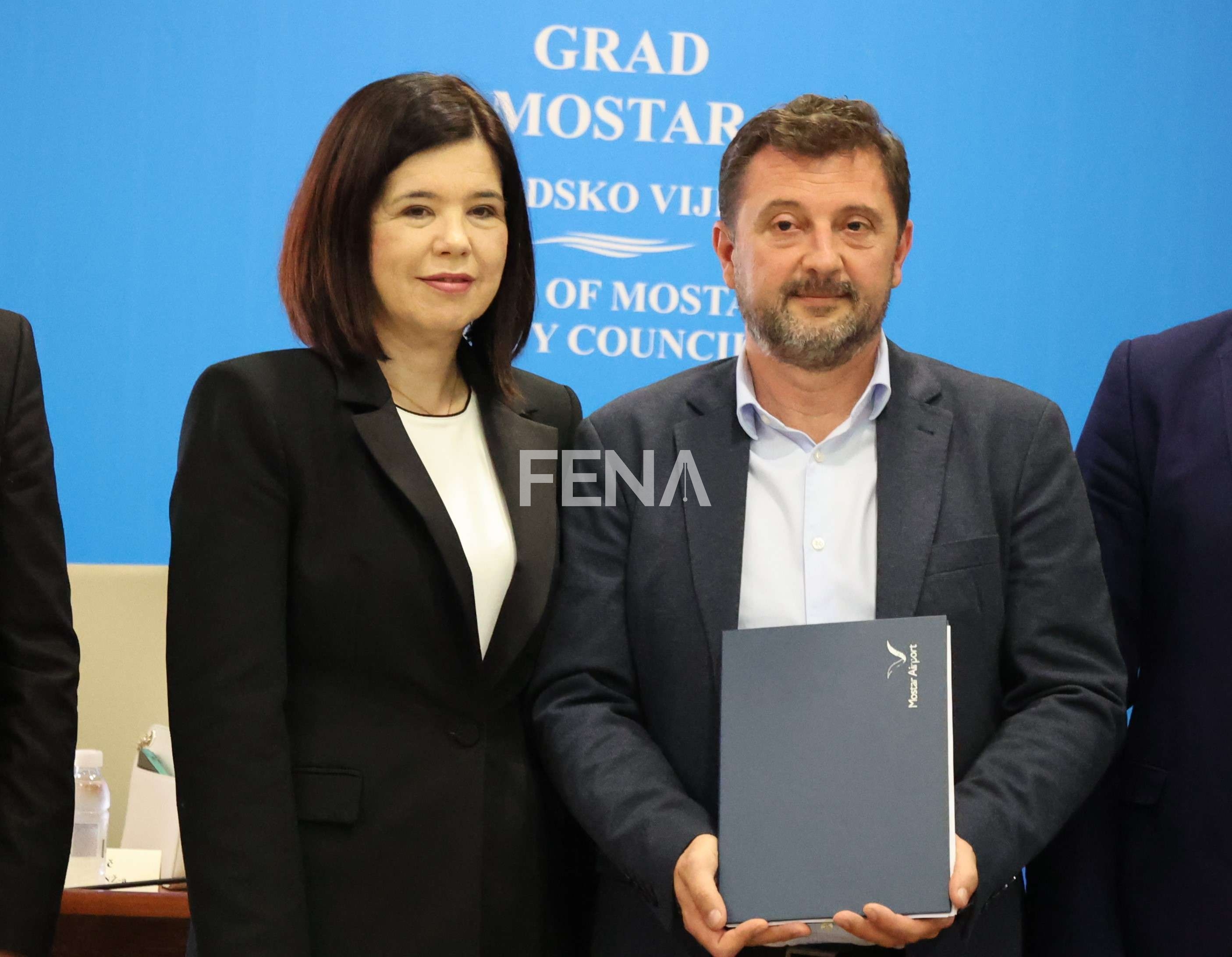 MOSTAR, 28. aprila (FENA) - Grad Mostar uime Zračne luke Mostar i kompanija "Air Tractor" iz Osijeka potpisali su u ponedjeljak u Mostaru ugovor prema kojem će ta osječka firma biti zadužena za zračno patroliranje, početno otkrivanje i gašenje požara iz zraka na području Hercegovine.(Foto FENA/Branka Soldo)