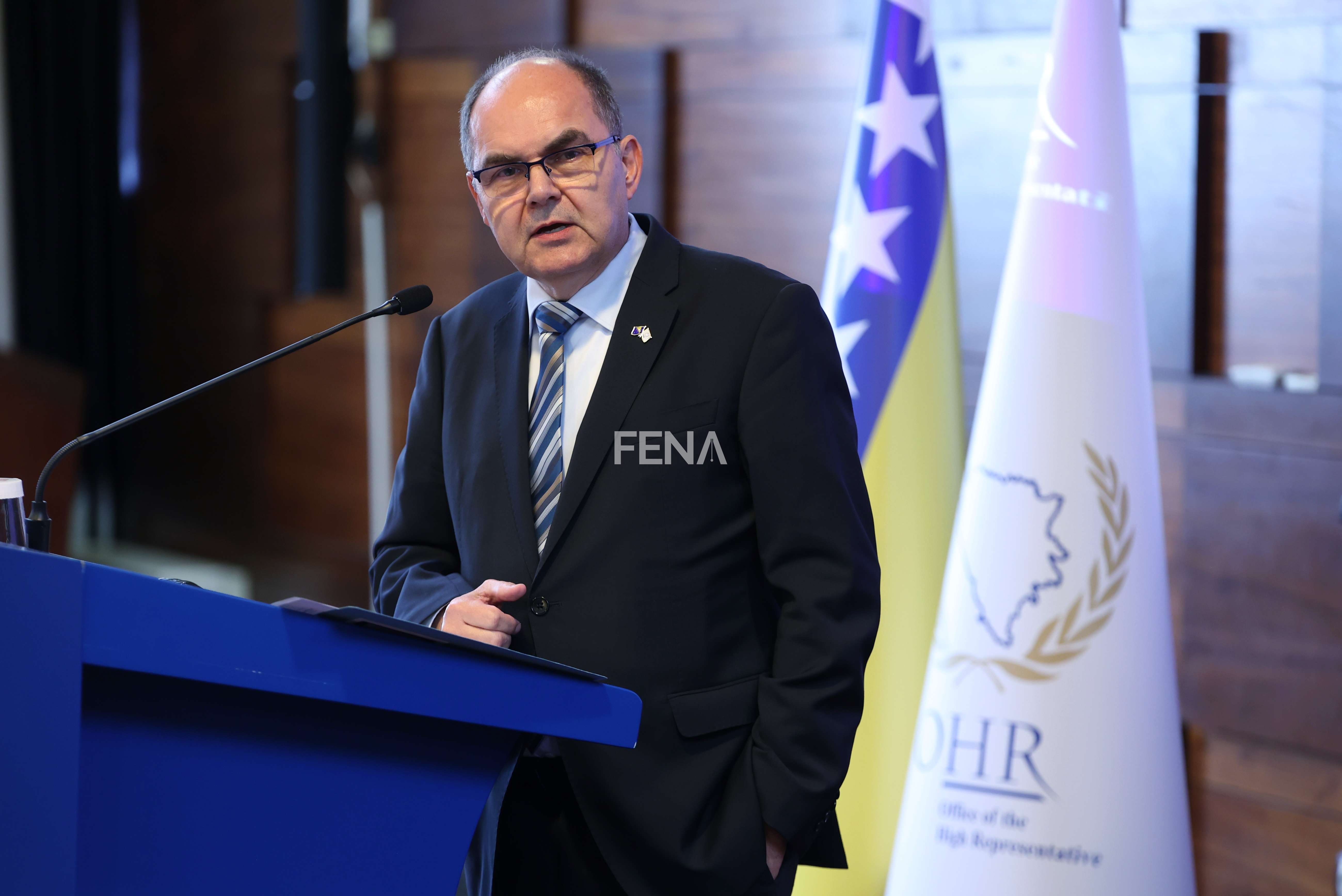 SARAJEVO, 4. juna (FENA) - Visoki predstavnik za BiH Christian Schmidt pozvao je sve lidere političkih partija da rade svoj posao, kazavši da ukoliko oni rade svoj posao, onda on nema potrebe da koristi bonske ovlasti. Na pres-konferenciji nakon dvodnevnog zasjedanja Upravnog odbora Vijeća za provedbu mira, na kojem je razmatrana aktuelna situacija u Bosni i Hercegovini, Schmidt je ponovio da entiteti postoje samo u okviru Bosne i Hercegovine na način na koji je to definirano Ustavom BiH. (Foto FENA/Hazim Aljović)